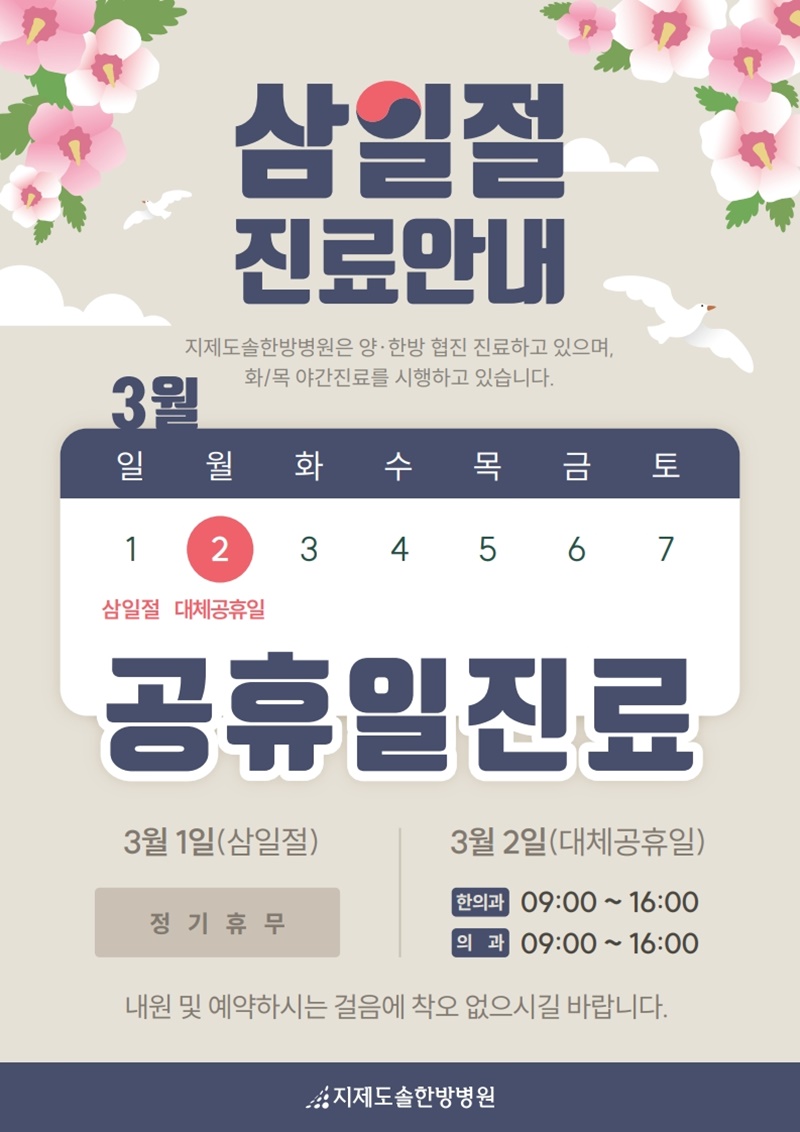 지제도솔한방병원은 삼일절 대체공휴일에도 진료합니다.